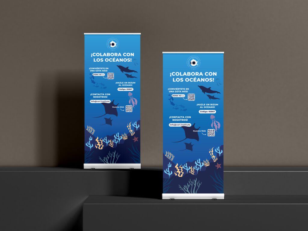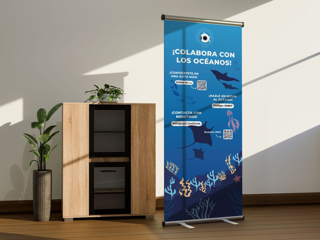 En este caso se diseñó un roll-up para una charla de CORI, la charla tenía como objetivo concienciar sobre el estado actual del océano y que los asistentes pudieran donar un pequeño monte de dinero para continuar con la labor de exploración y preservación de los océanos. CORI es una ONG que se encarga de investigar los océanos y mares de las costas de la Región de Murcia con el fin de conocer más sobre el comportamiento marino y poder cuidar el medio oceánico.